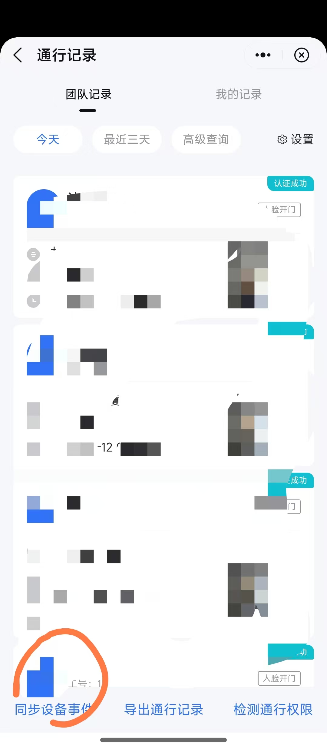 #第三步点击同步设备事件,选中之前断网,现在恢复的设备进行通行记录重新上传